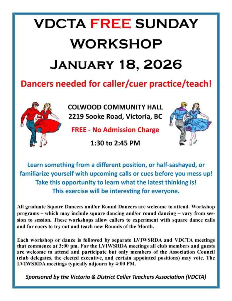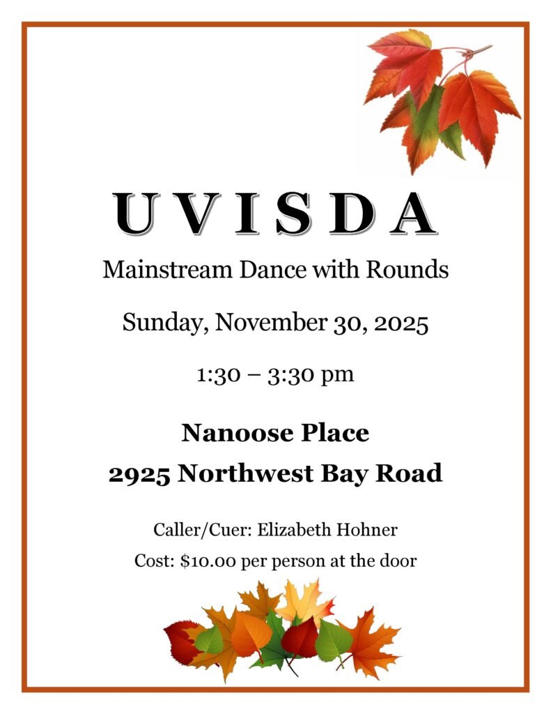 COMING Events Posters in date order for upcoming Lower Vancouver Island events together with posters for selected events outside our Region. Scroll down to view them all.Visit our CALENDAR page for the details of local dance events. Quick List: NOVEMBER 2025 DANCES (pdf) Country Cousins Square Dance ClubANNUAL PJ DANCEwith Caller/CuerKIRK ROCKERBIECordova Bay United Church HallSaturday, November 22, 2025 Upper Vancouver Island Square Dance AssociationMAINSTREAM DANCE WITH ROUNDSwith Caller/CuerELIZABETH HOHNERNanoose Place – 2925 Northwest Bay RoadSunday, November 30, 2025 Country Cousins Square Dance ClubWINTER WONDERLAND DANCEwith Caller/CuerKIRK ROCKERBIECordova Bay United Church HallSaturday, December 13, 2025 Mavericks Square Dance ClubWINTER MAGICwith Callers/CuersMARILYNNE CUNNINGHAM & LORNE CLAYTON Cordova Bay United Church HallFriday, December 19, 2025 Frontier Twirlers Square Dance ClubCOME DANCE WITH SANTAwith Caller & CuerGARRY DODDS & PAT ZEEMANColwood Community HallSaturday, December 20, 2025 Victoria & District Caller Teachers Assn. andLower VI Western Square & Round Dance Assn.FAREWELL TO 2025 DANCEwith a Panel of Callers & CuersColwood Community HallSunday, December 28, 2025 Victoria & District Caller Teachers Assn.FREE SUNDAY WORKSHOPColwood Community HallSunday, January 18, 2026 Country Cousins Square Dance ClubDOWNTON ABBEY THEME DANCEwith Caller/CuerKIRK ROCKERBIECordova Bay United Church HallSaturday, January 24, 2026 Country Cousins Square Dance ClubSWEETHEART BALLwith Caller/CuerKIRK ROCKERBIECordova Bay United Church HallSaturday, February 14, 2026 Upper Vancouver Island Caller Teachers Assn.ROUND-A-RAMAwith a Panel of CuersNanoose Place – 2925 Northwest Bay RoadSunday, February 15, 2026 Watch for poster closer to event date. Victoria & District Caller Teachers Assn.NEW DANCER HOEDOWNwith a Panel of CallersColwood Community HallSunday, February 22, 2026 Watch for poster closer to event date. Country Cousins Square Dance ClubLUCKY LEPRECHAUNS DANCEwith Caller/CuerKIRK ROCKERBIECordova Bay United Church HallSaturday, March 14, 2026 Victoria & District Caller Teachers Assn.FREE SUNDAY WORKSHOPColwood Community HallSunday, March 15, 2026 Watch for poster closer to event date. Lower VI Western Square & Round Dance Assn.SWING INTO SPRING(LVIWSRDA & UVISDA JOINT DANCE)with Caller/CuerGARY WINTER, SHERWOOD PARK, ABColwood Community HallSunday, March 29, 2026 Victoria & District Caller Teachers Assn.ROUND DANCE PARTYwith a Panel of CuersColwood Community HallSunday, April 12, 2026 Watch for poster closer to event date. Victoria & District Caller Teachers Assn.FREE AFTERNOON MAINSTREAM DANCEwith a Panel of Callers and CuersColwood Community HallSunday, April 19, 2026 Watch for poster closer to event date. Upper Vancouver Island Caller Teachers Assn.FRESHMAN FROLICwith a Panel of CallersNanoose Place – 2925 Northwest Bay RoadSunday, April 26, 2026 Watch for poster closer to event date. Victoria & District Caller Teachers Assn. andLower VI Western Square & Round Dance Assn.2026 SPRING ROUND-UPwith a Panel of Callers & CuersColwood Community HallSunday, May 3, 2026 Watch for poster closer to event date. Country Cousins Square Dance Club70th BIRTHDAY DANCEwith Caller/CuerKIRK ROCKERBIEColwood Community Hall(Note different dance hall)Saturday, May 9, 2026(Note special time: 3:00-5:00 pm) Upper Vancouver Island Caller Teachers Assn.JUNE SPECIAL DANCEwith a Panel of CallersNanoose Place – 2925 Northwest Bay RoadSunday, June 7, 2026 Watch for poster closer to event date. 24th CANADIAN NATIONAL FESTIVAL 2026Penticton Trade & Convention CentrePenticton, BCWednesday, July 15 to Saturday, July 18, 2026 24th Canadian National Festival 2026 Website